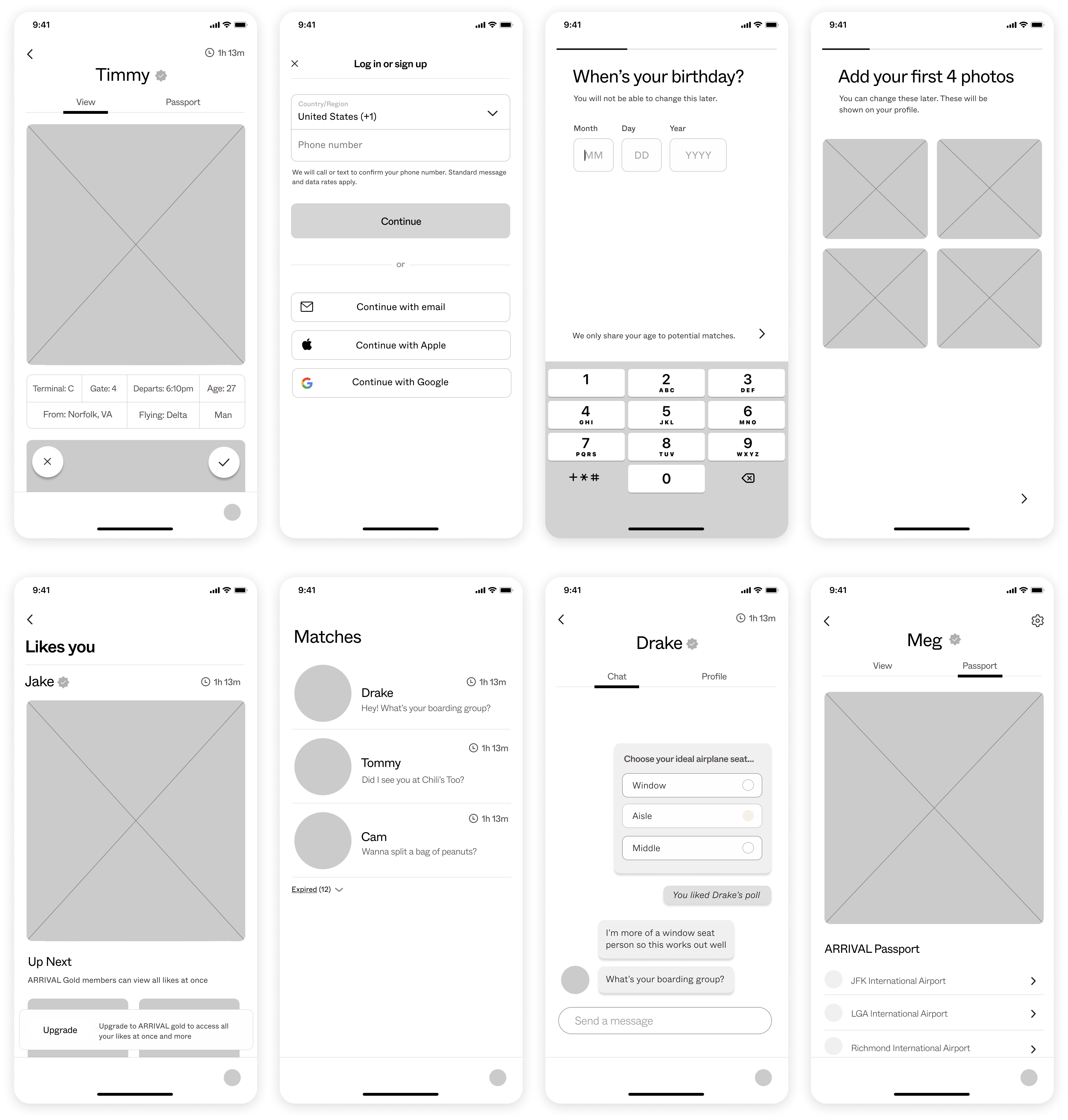 The mobile app framework was heavily inspired by Hinge, a popular dating app on the market today. In order to better understand the target user, specifically those using the app in airports, we created a journey map marking highlights from their thought process.